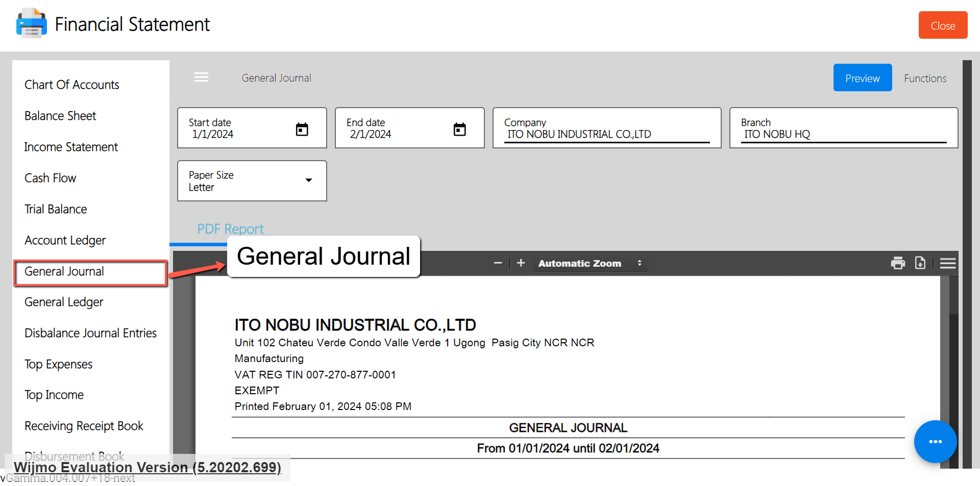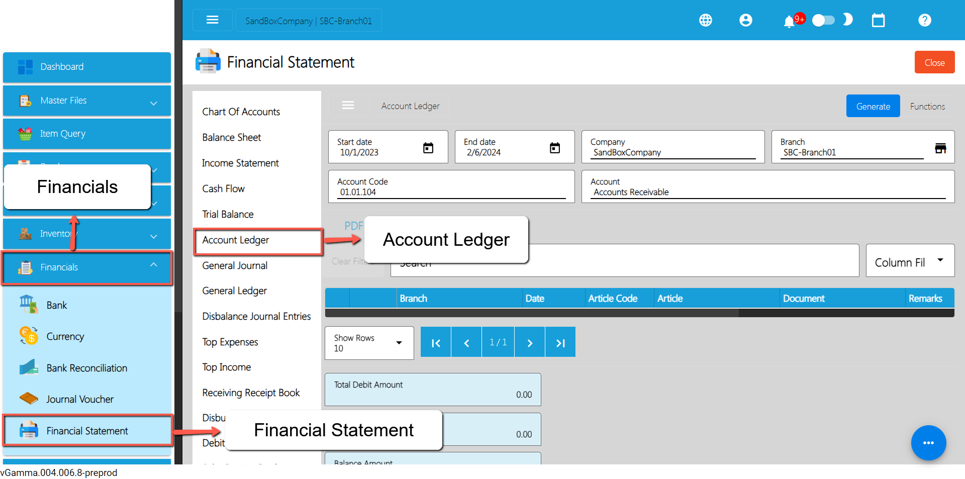 The financial module generates the Financial Statements such as Trial Balance, General Ledger, Balance Sheet and Income Statement. It collates all the journal entry transactions from Sales, Purchasing and Inventory Modules.