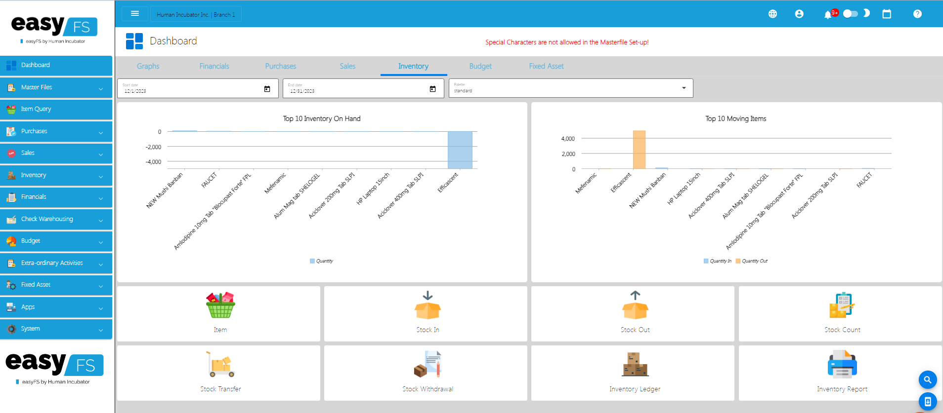 EasyFS Dashboard – shows the most important things in the system such as the Graphs, Financials, Purchases Sales, Inventory, Budget, and Fixed Asset.